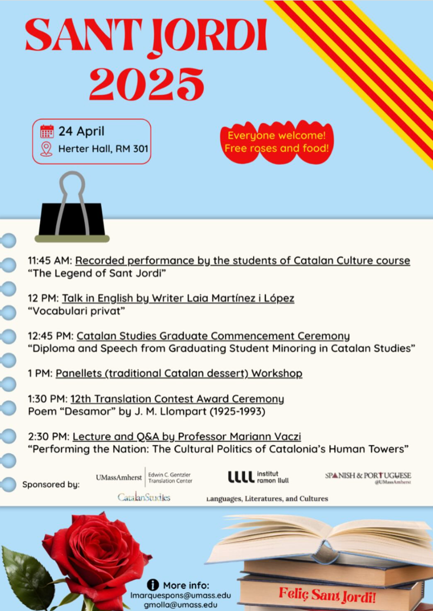 (Des del Programa de Català de UMass, us volem convidar a la nostra Diada de Sant Jordi, que aquest any se celebrarà dijous 24 d'abril, d'11:45h a 16h, a la sala 301 de Herter Hall. A la foto detallem el nostre programa, amb totes les activitats i tallers preparats! Hi haurà menjar i roses vermelles per a tots! Tot això és possible gràcies a la col·laboració de @irllull, @spanportumass, Edwin C. Gentzler Translation Center i el Departament de Llengües, Literatures i Cultures de UMass. És gratuït i tothom és benvingut! Animeu-vos-hi!)